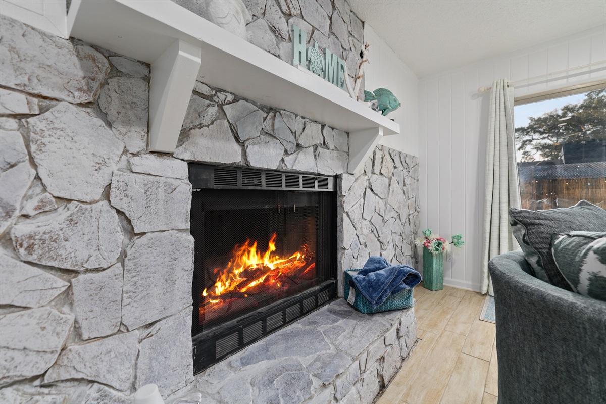 • Cozy fireplace for year-round enjoyment with comfortable seating