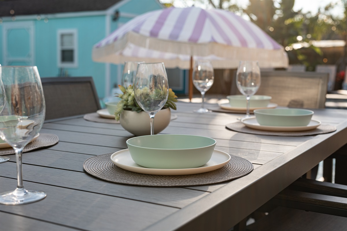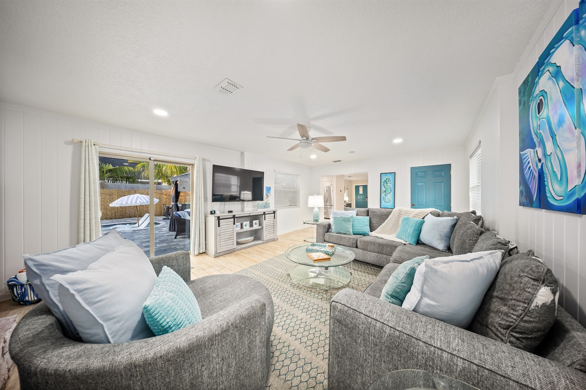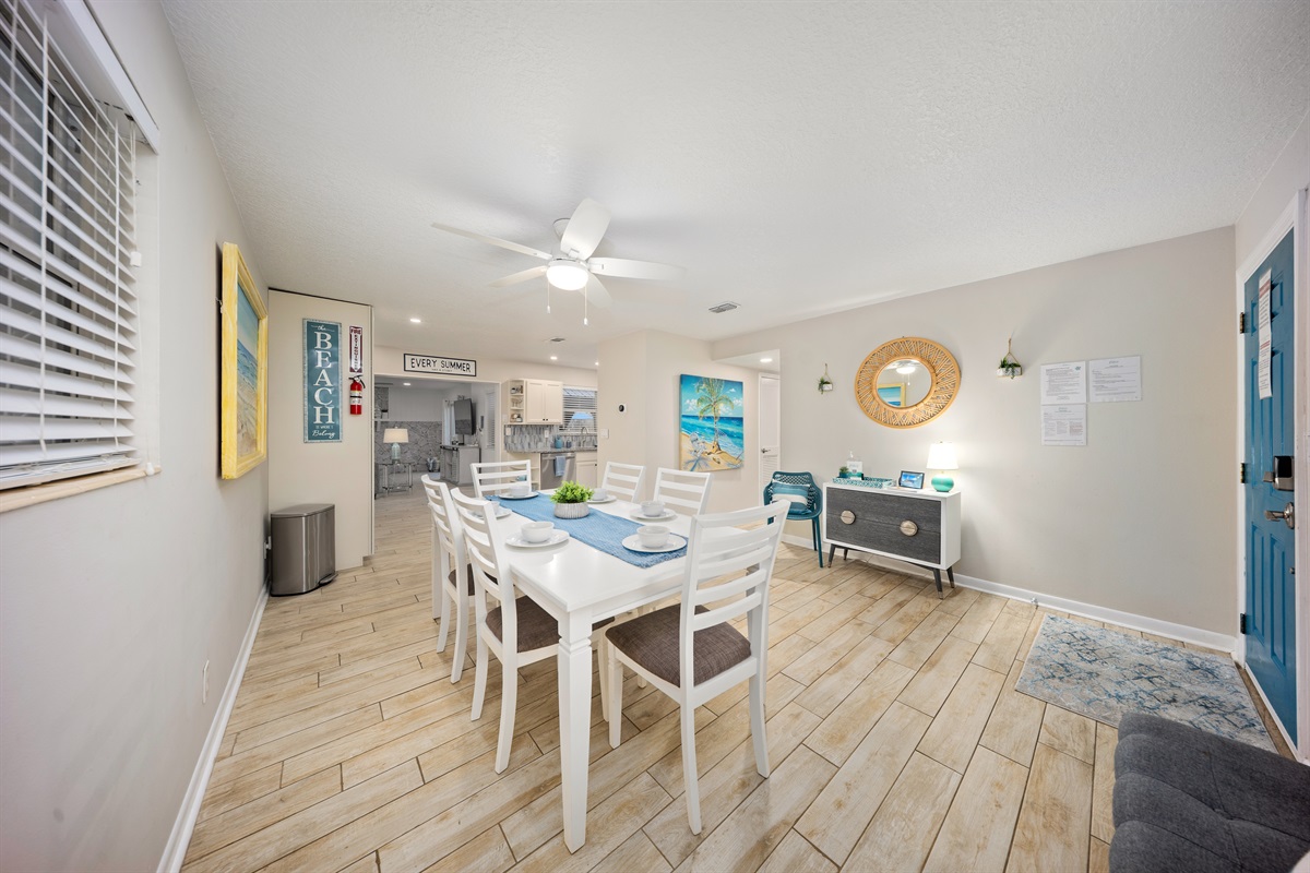 Perfect for families and groups, Beachside is a 4BR, 2BA tropical retreat with a private casita and a backyard with resort-inspired amenities—featuring a heated pool and spa, putting green, outdoor lounge with fireplace and TV, and a game room with shuffleboard and ping-pong. Pet-friendly, Beachside will have you enjoying multiple living spaces and a layout built for gathering, all just 8 blocks from the beach.