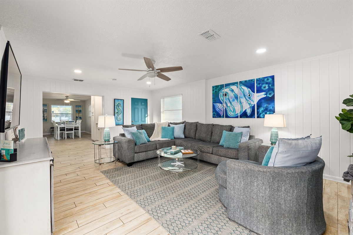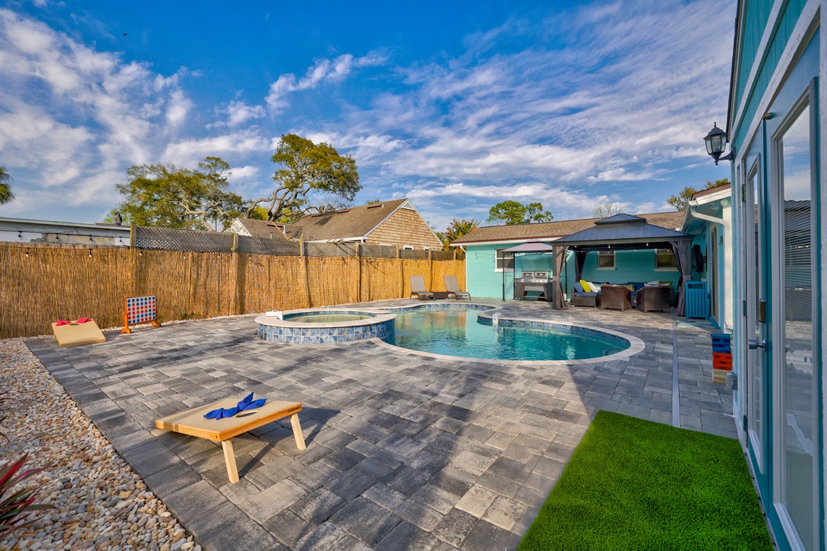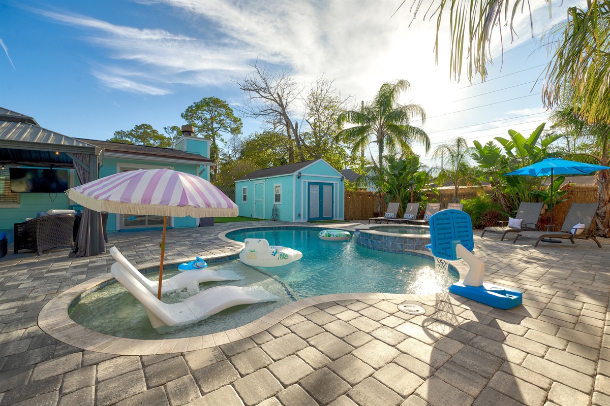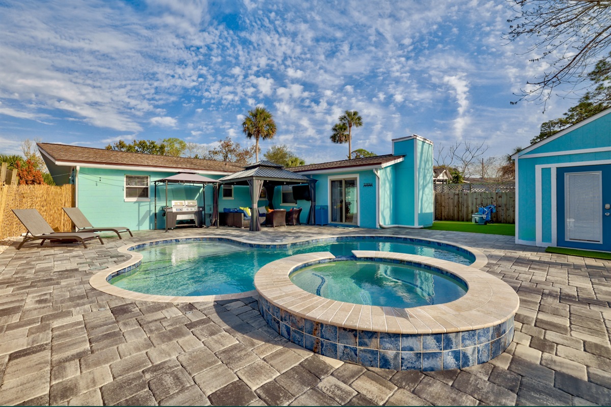 Perfect for families, large groups, and multi-family getaways, Beachside is a spacious 4BR, 2BA single-story coastal retreat with a private casita, designed for connection, comfort, and fun. Enjoy a backyard resort featuring a heated saltwater pool and spa, private putting green, covered outdoor lounge with fireplace and TV, outdoor dining, and a fully equipped game casita with shuffleboard, ping pong, and gaming system. Located just 8 blocks from the beach in Jacksonville Beach, this home offers an easy bike ride or short drive to the sand, dining, and local favorites.