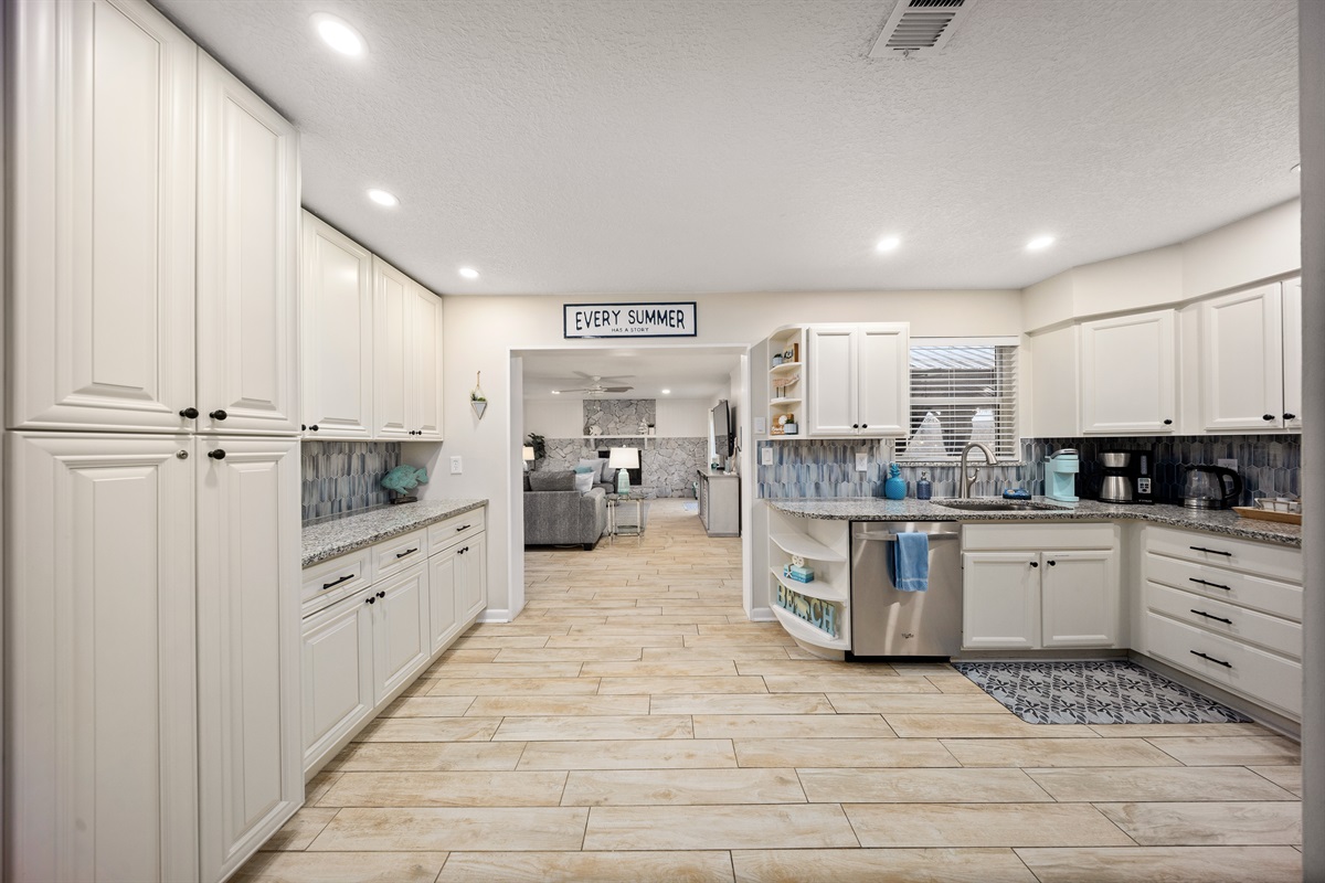 • Fully stocked kitchen with modern appliances and oversized island with bar seating
