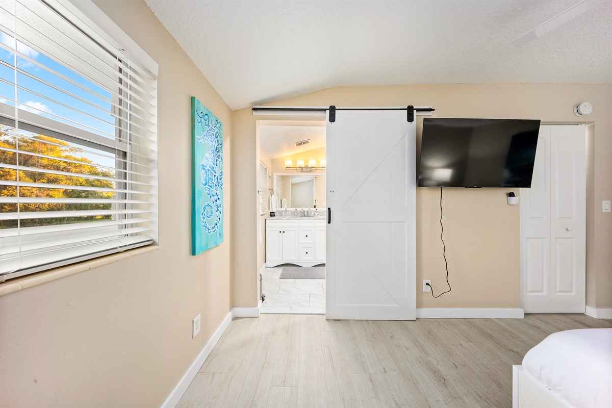 King bed with private ensuite bathroom featuring double vanity and walk-in shower
