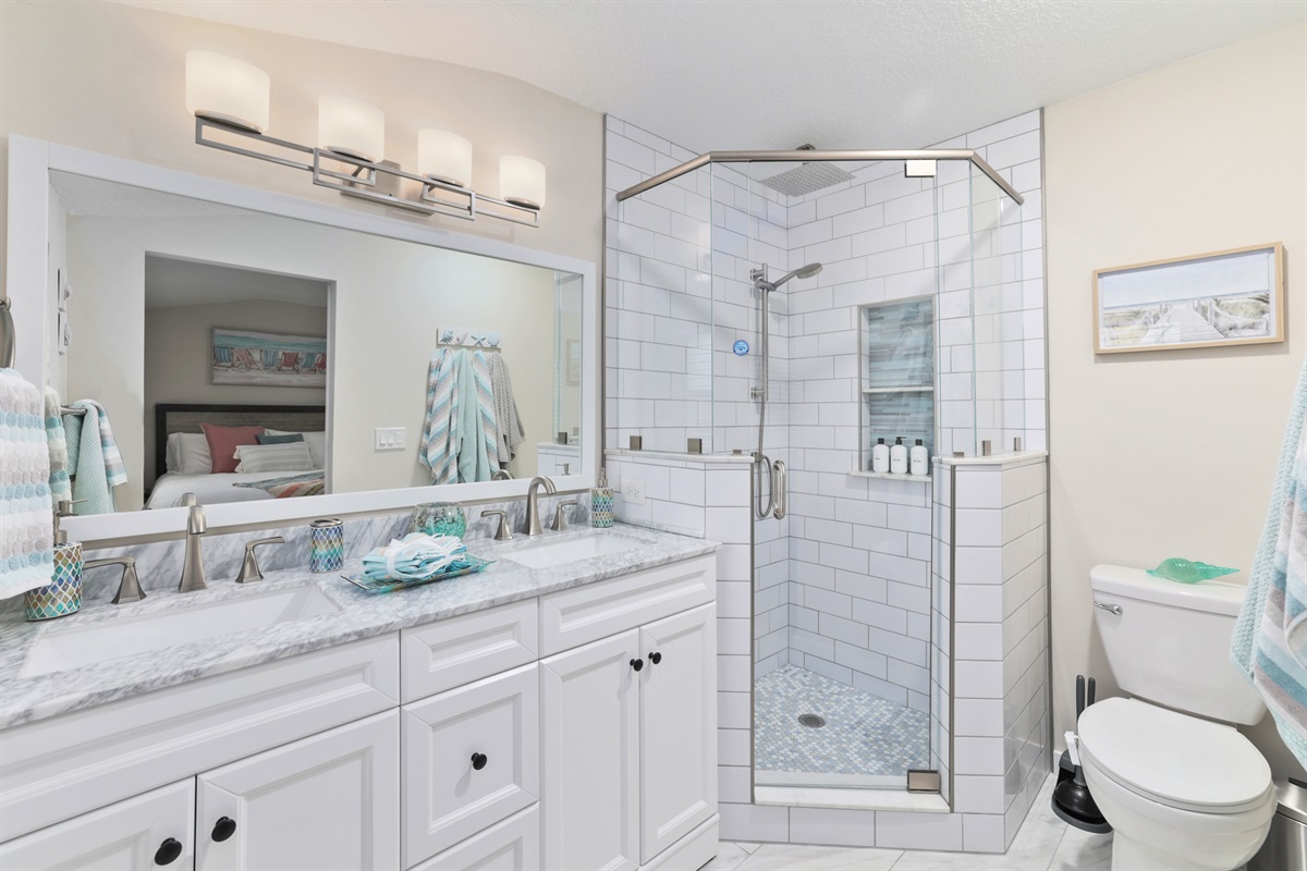 Beachside features thoughtfully designed bedrooms and bathrooms with clean, coastal finishes, including walk-in showers, updated vanities, and spacious layouts designed for comfort and convenience. Each bedroom offers cozy bedding, Smart TVs, and a relaxed atmosphere for unwinding after a day at the beach or pool.