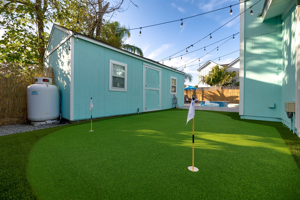 Start your morning with coffee under the covered patio or a quick bike ride to the beach. Spend your day rotating between the pool, spa, and putting green, while kids and friends enjoy the game-filled casita. As the sun sets, gather for dinner outdoors, relax by the fire table, or float under the stars in your private backyard retreat.