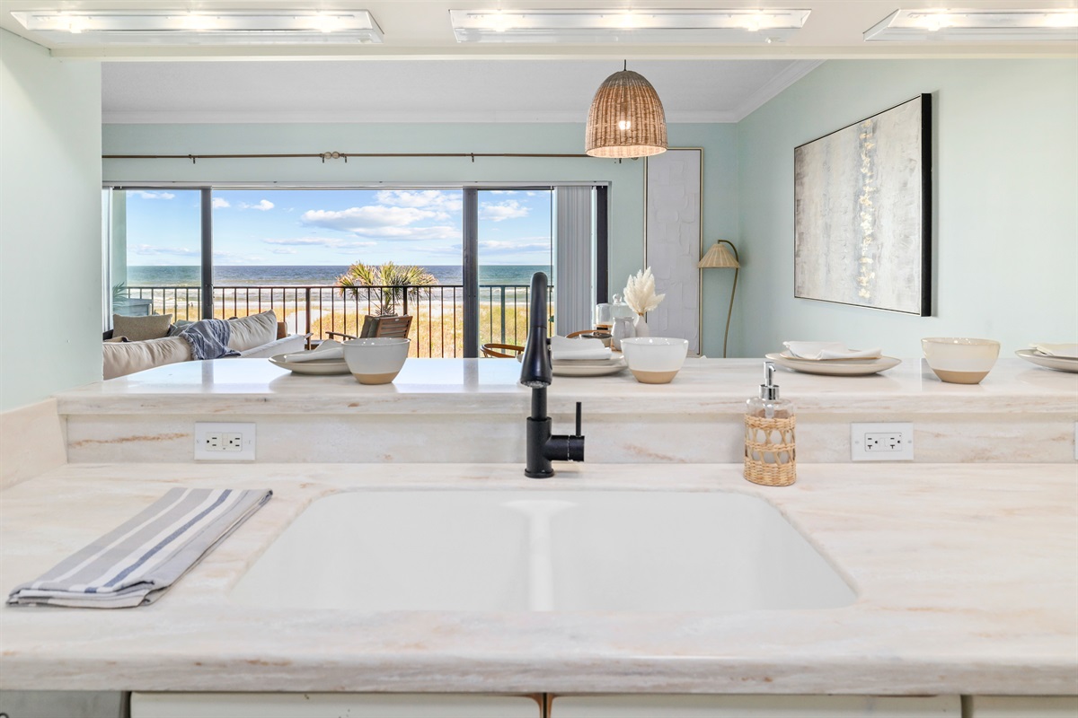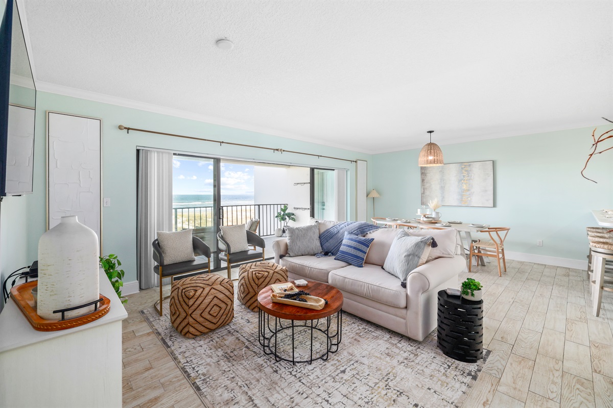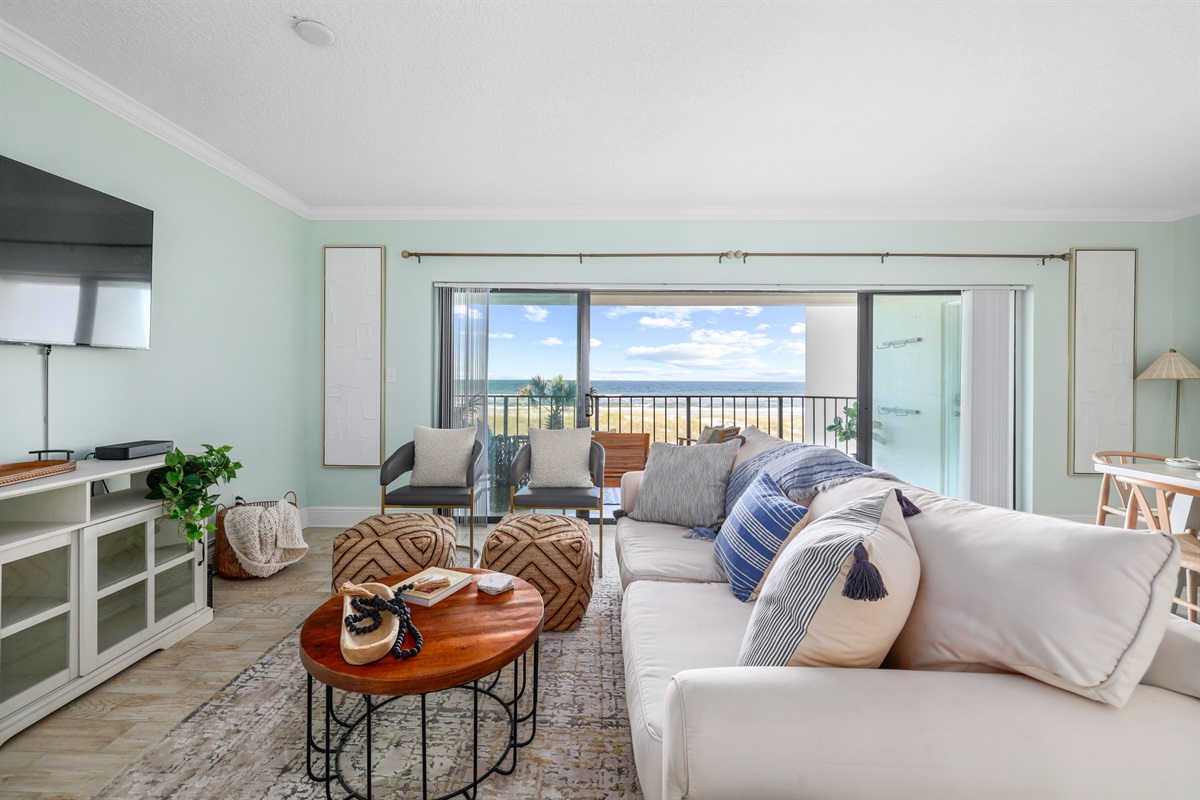 Wake up to the sound of waves at this light-filled oceanfront villa. A wall of glass opens to a private balcony where morning coffee comes with endless Atlantic views. Inside, the open layout blends a coastal living room (smart TV and comfy seating) with a fully equipped kitchen featuring stainless appliances, a long breakfast bar, and a dining area perfect for lingering meals after the beach.