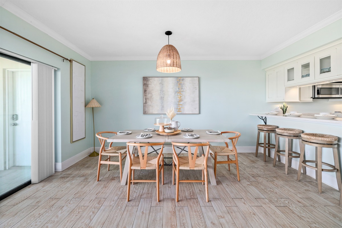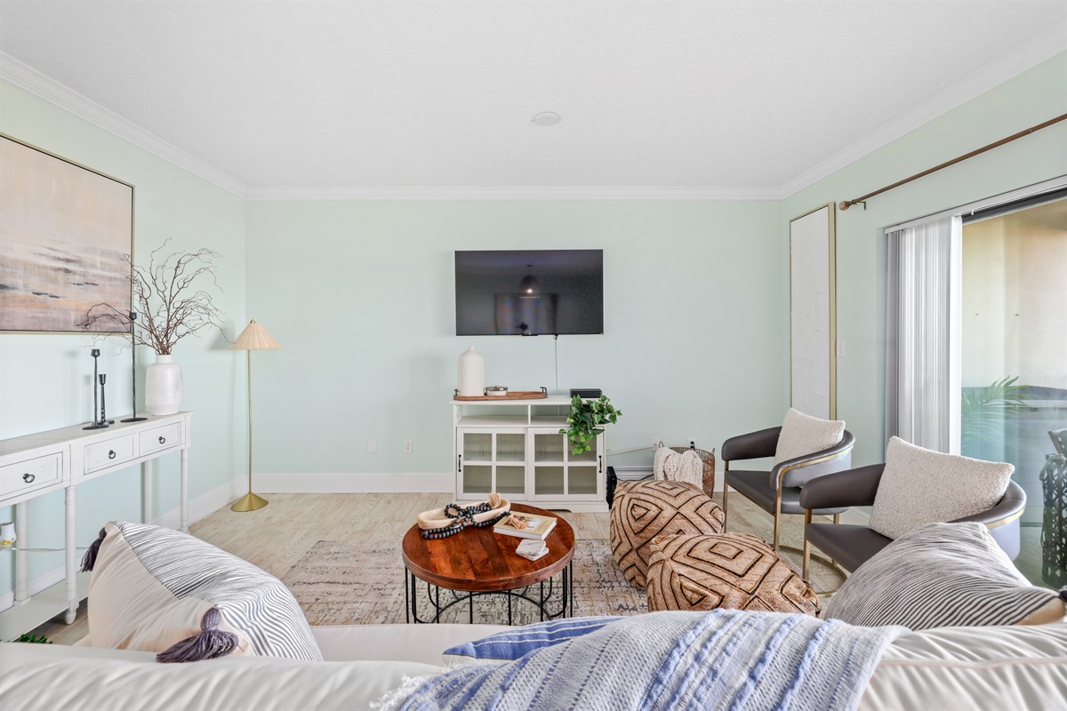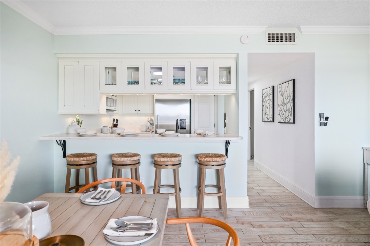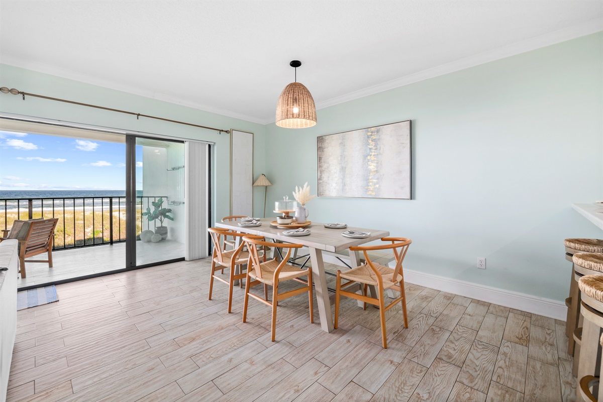 Wake up to the sound of waves at this light-filled oceanfront villa. A wall of glass opens to a private balcony where morning coffee comes with endless Atlantic views. Inside, the open layout blends a coastal living room (smart TV and comfy seating) with a fully equipped kitchen featuring stainless appliances, a long breakfast bar, and a dining area perfect for lingering meals after the beach.